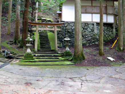 簡易水道施設がある。そしてその先の橋を渡る。突き当たりに鳥居があり、左右に分かれた道を右折して細い道を突き進むとやっと登山口に着いた。