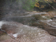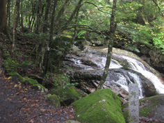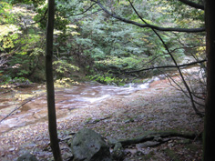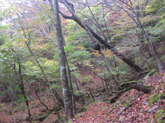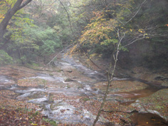 | 展望もなく、20分程休んでいるうちに雨になった。奥千畳を見ていないので渓谷コースを下りることにした。 熊ノコルに下り、奥千畳へと向かう。雨に打たれて木々が鮮やかに浮き上がり、紅葉した葉が輝いている。 1時間程下ると渓谷が見えてきた。13:22分奥千畳に到着。美しいナメで濃霧もあって深山幽谷に迷い込んだ感じだ。 そして20分位で白崖分岐に13:45分着く。又、千畳敷、滝、淵と思う存分渓谷美を堪能。 雪輪ノ滝からは反対の左岸コースの遊歩道を歩き、万年橋駐車場へ戻った。野猿にもあわず、 素晴らしいナメを楽しんだ山登りだった。 |