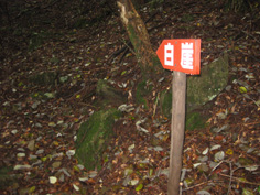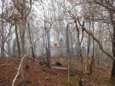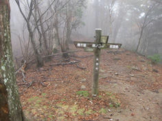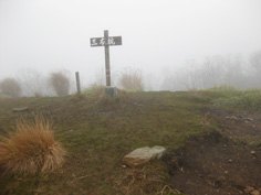 | このまま奥千畳に向かうつもりだったが、こちらの方が近そうなので白崖コースを進むことにした。 悪路と標識があったが、所々道がなくなる直登だった。 休む間もない急登1時間程で支尾根から広い尾根状になった。 葉を落とした木々は濃霧に囲まれ、急登をあえいでいるうちに展望がすっかりなくなっていた。 鹿柵を2回くぐり抜けると突然広い大地になり、三本杭山頂に到着。なんだかあっけなく着いた感じだ。 山頂には2組の登山者が賑やかだったので、そばに行くとクワガタが山頂標識を歩いていた。 今日はとても暖かく、クワガタも春と勘違いしたのかなと話しながら2組の登山者は下山していった。 |