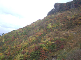 | 15:05分駐車場を出発。風もなく暖かな日で、大勢の人が下りてきていた。全員にこれから登るのですか?と言われ、急いで登ったので30分かからないで山頂に着いた。山頂からの紅葉が素晴らしく、特に突出した三方岩岳の頂きはまるで錦の衣を着ているようだ。ハイマツだと思っていたがキタゴヨウマツだそうでこの緑との織りなす色合いは本当に見事だ。10分程山頂景色を楽しみ、誰もいなくなった道を紅葉を愛でながら往路を下る。駐車場4:07分着。広い駐車場には3台しか車が止まっていなく、静かになった白山スーパー林道を紅葉を楽しみながらゆっくり下りた。 |