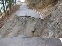 更に進むと、道路は土砂で埋まり倒れた木々も積み重なって小山のようになっていた。崖崩れの恐ろしさを眺めながらよじ登る。 すると今度は道路に長く縦に亀裂が入っていて、段差は高い所で1bはありそう。恐る恐る通り抜ける。