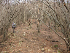 昨日、下見をしたので高見山案内板のそばに何台か止まれるスペースに車を置く。通行止めのロープをくぐり、広く快適な舗装道路を進む。 どこが不通なのかと思い、右に高見山を見ながら30分位進むと、突然道がストンと陥没。脇の急斜面を這いつくばって通り抜け、