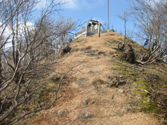豪雨でこんなにも道路が破壊されるものなのかと恐れを感じる。それから10分位歩いて、林道歩き1時間4分で高見峠に着いた。 |