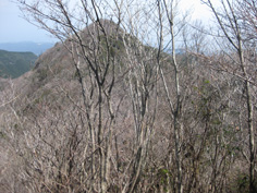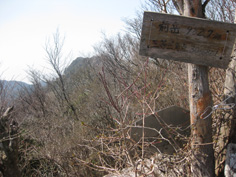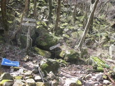 | 鎖場を超して、巨岩を抜け、頂稜分岐点に出た。右へ5分程歩いて多良岳山頂に13時に到着。 山頂には上宮の石祠があり、山頂標識らしきものは見当たらない。 経ガ岳を見ながら10程休んで、三角点のある前岳に行くことにした。 いきなりの下り、狭い稜線上の巨岩をまたぎ、ハシゴを登りと変化にとんでいる道の狭い巨岩の下でご夫婦と出会う。 今日は2組の登山者しかいなかったが、多良岳山頂から20分歩いて前岳山頂に到着。 石が重なった狭い山頂は三等三角点で、多良岳より14a低い982aだった。多良岳を眺めながら往路を下る。 又、多良岳の山頂に戻り、暖かい日差しを受けて中山キャンプ場登山口14:49分着。 途中、蛇を踏みそうになって走って通りすぎた時帽子をとばしてしまった。戻って探したが見つからなく、沢に飛んでってしまったようだ。 |