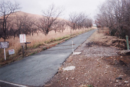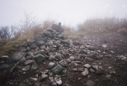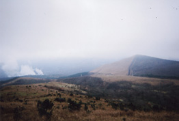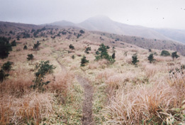| 遠くに雲がかかって5合目位までしか見えない涌蓋山が見え、 その遠さにおどろきながら一目山を真っ直ぐ下り道路に出ると、涌蓋山登山口の道標が建っていた。牧場に沿って進んでいくと、牧柵を越え緩やかな登りが始まった。緩やかな草付斜面は延々と続く。 みそこぶし山を巻きながら草付斜面を横切るように進む道の右側には、大きな涌蓋山があるがガスがかかって下の方しか見えない。 又、牧柵を越え、人工林を抜けると林道に出た。ここが涌蓋越というそうだが林道歩きは50bぐらいで右側に入り今度は樹林帯になった。 ミヤコザサが一面に繁る雨裂の道はドロンコで歩きずらい。 |