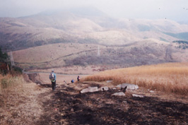 上の方はガスがかかって様子がわからないが、振り返ると今まで歩いてきた道が丘陵のようにズーと続き1時間半位しか歩いていないのに、