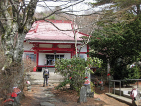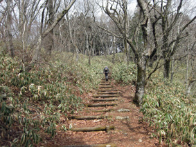 | 大きな鳥居がある蛇穴登山口から鳥居をくぐり、八溝林道に入る。山頂まで車で行くことが出来て雪はすっかりなくなっていた。 山頂から 少し戻って日輪寺の駐車場に車を止め、お参りしてから山頂へ歩くことにした。境内のすぐ横から登山道は続いていて2〜3分で車道を横断。 ブナやイヌブナの遊歩道を30分程歩くと山頂に到着。途中、銀性水に寄ったが水はなくカラカラに乾いていた。 広い山頂には八溝嶺神社や立派なお城の展望台があり展望は抜群、那須連山がくっきりと見え、 まだ葉が出ていない落葉樹の間からも景色が広がっている気持ち良い尾根道を日輪寺へと戻った。 |