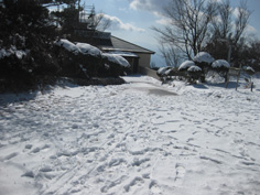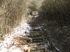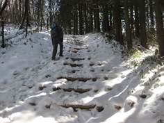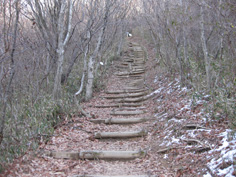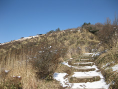 | 水越峠から大和葛城山登山口8:50分スタートする。人の気配もなく静かな登山道の階段を上って行く。 落葉樹林から笹林になり、40分程で尾根上に出た。 ダイヤモンドトレールと書かれた立て札と葛城山1.3`水越峠1.2`の標識が建ってる尾根道は杉木立になって雪量も多くなってきた。 杉林を抜けると草原状になり、明るく、ベンチなども見えて山頂近くなった。高原ロッジへの階段を上ると一面の雪が日に照らされて眩しい。 |