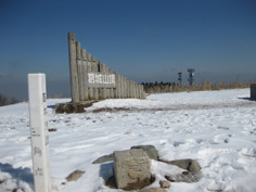 | 緩やかな丘を登ると大和葛城山山頂に到着。360°の大展望だが雪で座るところがないので、先ほどの高原ロッジの南側のベンチに戻る。 金剛山の立派な姿を目の前に見ながらしばし休憩し、往路を下る。登山口10:50分に着いたが、朝には車2台しかなかった峠にはたくさんの車がとまっていた。 すぐ近くに金剛山登山口があるので、みんな金剛山に登っているのだろうか。葛城山では誰にも会わなかった。そう思っていると車を降りた3人の登山者が葛城山に向かって行った。 私たちは正面登山道から金剛山に登りたいので車に乗り千早に向かった。 |
