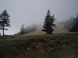 | あんなに良い天気だったのに、岩菅山から下山して横手山に向かう時も晴天で、渋峠に着いたとたん霧が発生、濃霧になってしまった。 ここからは30分位歩くと山頂だというのに、歩く気も失せ、リフトに乗り込む。風も冷たくなってダウンを着込んでリフトに乗ったが、リフトに乗っている人は殆どいない。 山頂に着くと、リフト係のお兄さんが寒そうだ。下りてすぐ横の鳥居をくぐり、5分程歩くと横手山山頂に着いた。 |