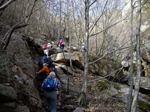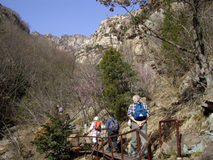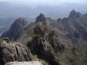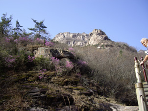 色々なコースがあるようだが、沢コースで頂上の天皇峯へ行く登山道をジョさん、ハクさんが案内してくださった。月出山遭難救助隊長のジョさん、通訳のハクさんは共に、霊岩郡庁の職員さんで、私達5人は、この一週間霊岩郡の各地を案内して頂いた。 登山口8:30分出発。石を敷き詰めた道はまだ木々の芽吹きがないので、サンサンと日が入り快適。すぐに、断崖絶壁につけられた鉄製階段になる。この階段はVベルトを切断して敷き詰めてあるので滑らなく幅も広く、歩きやすい。エゾヤマツツジの鮮やかな紫が点在する中、大岩を乗り越え、くぐり、30分位歩くと谷を挟んだ峰につり橋が見えてきた。このつり橋は(雲橋)地上120bの高さに建設され、長さ52bで韓国で一番長いつり橋だという。 そして間もなく、滝に出る。この辺りからイチゲやスミレ、カタクリなどの春の花が姿を見せる。巨大な一枚岩が積み重なった岩群や岩峰を見ながら、鉄階段を幾度も登る。稜線近くになると、あのつり橋はかるか左下の方に見える。最後の鉄階段を登り11:02分山頂の天皇峯に到着する。山頂は意外にも平たい岩盤で広々としており、同時に300人ぐらいは座ることができるという。麓に広がる雄大な景色を眺め、ひんやりとした風が心地よく、50分程休憩する。 下りは、すぐに急な鉄階段を下り、いろいろな形に見える岩が面白く、屋久島のような景色だなと思いながら分岐に出る。見上げる天皇峯の頂上に幾人かの人が動いているのを眺め、鏡浦臺登山口の方へと下る。カタクリの群生に川は流れ、気持ちの良い下りで13:40分登山口のキャンプ場に到着。 霊岩郡庁のスタッフの方が車を回して下さり、車に乗って麓の満開の桜トンネルを走る。韓国にも桜名所が随所にあり、見事な桜が点在している。丁度いま桜は満開で、その桜トンネルから見上げる月出山はとても高貴で、高い山にのぼってきたような満足感を感じる。 この霊岩郡は、日本に百済文化を伝えた所で、王仁博士の王仁廟が建てられている。そのせいか若い人でも日本語を勉強している人も多く、日本の歴史にも詳しく、霊岩陶器文化センターでは韓国と日本の歴史が並べて展示してあった。韓国も南の端となるとさすがに遠く、札幌発14時の便でまず仁川空港(インチヨン)へ。地下鉄にのって国内線の金浦(キンポ)空港へ移動し、ここから光州(ガンジュ)空港へ。そして車で1時間位乗りやっと霊岩郡に着く。飛行機が遅延したこともあり、霊岩郡の民宿についたのは真夜中12時だった。今回は、たくさんの韓国の人々とふれ合い、長い歴史のある韓国文化を肌で感じた、韓国を再認識する旅になった。 |