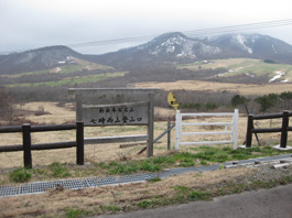 | 田代平高原の広々とした草原の中の車道を走る。左に田代山、右に七時雨山を見ながら、七時雨山新百名山登山口の案内板がある駐車場に着いた。広い駐車場には誰もいなかったが、トイレも完備され、目の前には七時雨山の全景が見渡せた。 |