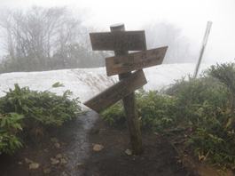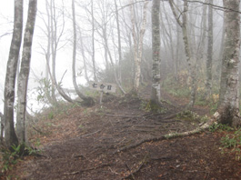 | 広大な草原の中を、七時雨山を見ながら真っ直ぐに進むと、樹林帯にぶつかった。それに沿った道を右に進むと、3合目の案内板があり、草原から樹林帯の登りになった。樹林帯の道は少しずつ急になり、樹の根が階段状になって登りやすく、4合目、5合目と標識を見ながら進む。いつのまにか霧が立ちこめ、濃霧になって、8合目位から雪道になった。9合目辺りから雨になり、雨と濃霧の中、七時雨山北峰に到着。 一等三角点を確認していると今度は風が強くなった。300b先の南峰に行くつもりだったが、このまま下りることにした。全く展望もない雨風の中、雪道をひたすら下る。7合目辺りで雨が止み、3合目の草原に出ると、風も収まり日が差してきた。そして駐車場に着いたら今度は時雨模様になり、帰る支度をして車に乗り込むと又、雨になった。一日に7回も時雨れるという七時雨山は本当にその名前の通りだと思いながら、霧で見えなくなった七時雨山を後にした。 |